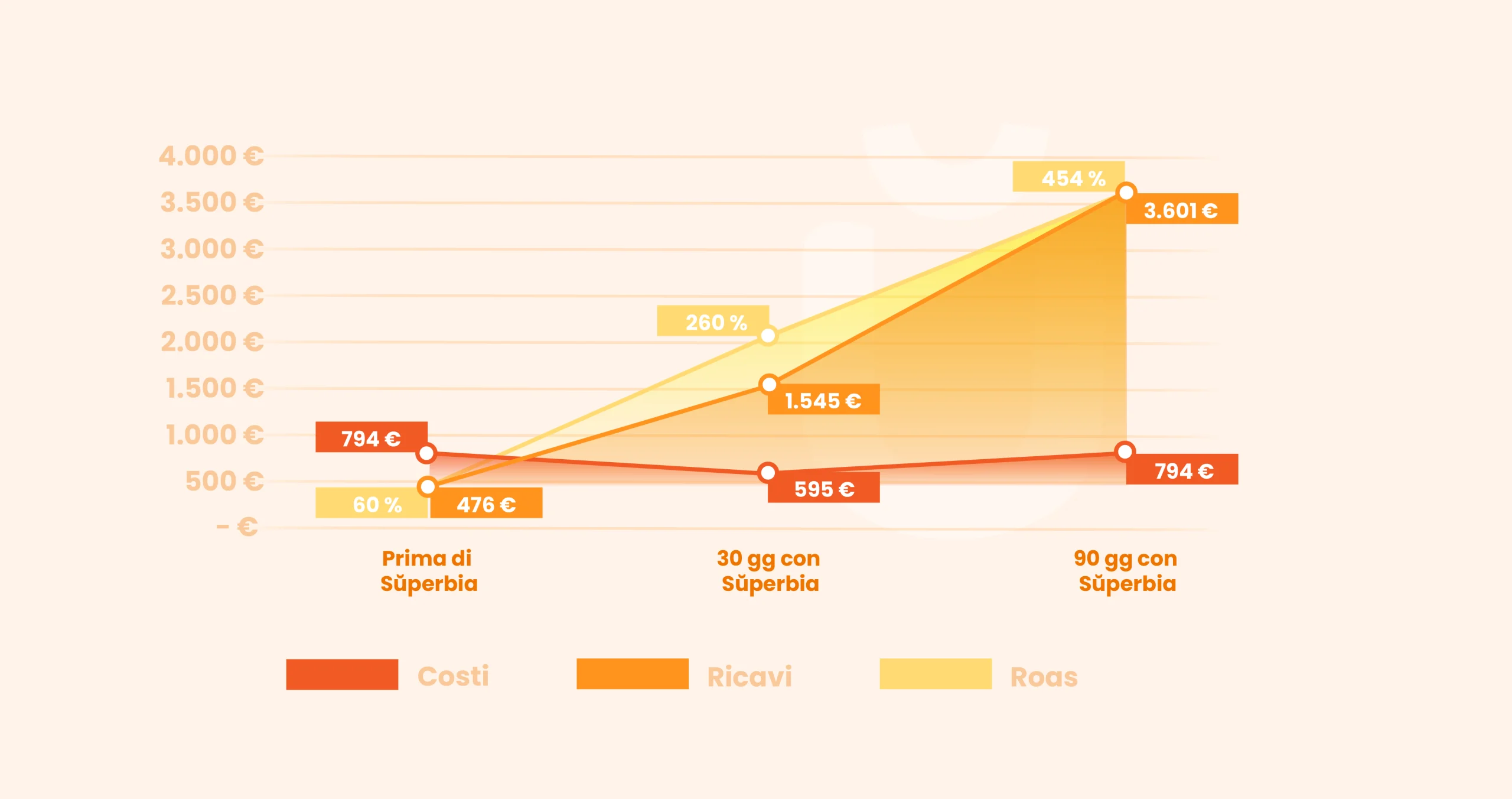 Ad agosto 2023, Nicola aveva speso in autonomia 794€ in adv, ottenendo ricavi per 476€, con un ROAS negativo del 60%. A fine settembre, con l’aiuto di Superbia, la stessa campagna pubblicitaria ottimizzata dal nostro studio, aveva speso 595€ nel corso del mese, ottenendo ricavi per il valore di 1.545€ e un ROAS del 260%. A novembre, dopo 90 giorni, la campagna spendeva esattamente la stessa cifra di agosto: 794€, ma questa volta con risultati ben diversi. I ricavi ammontarono a 3.601€ con un ROAS del 453%.